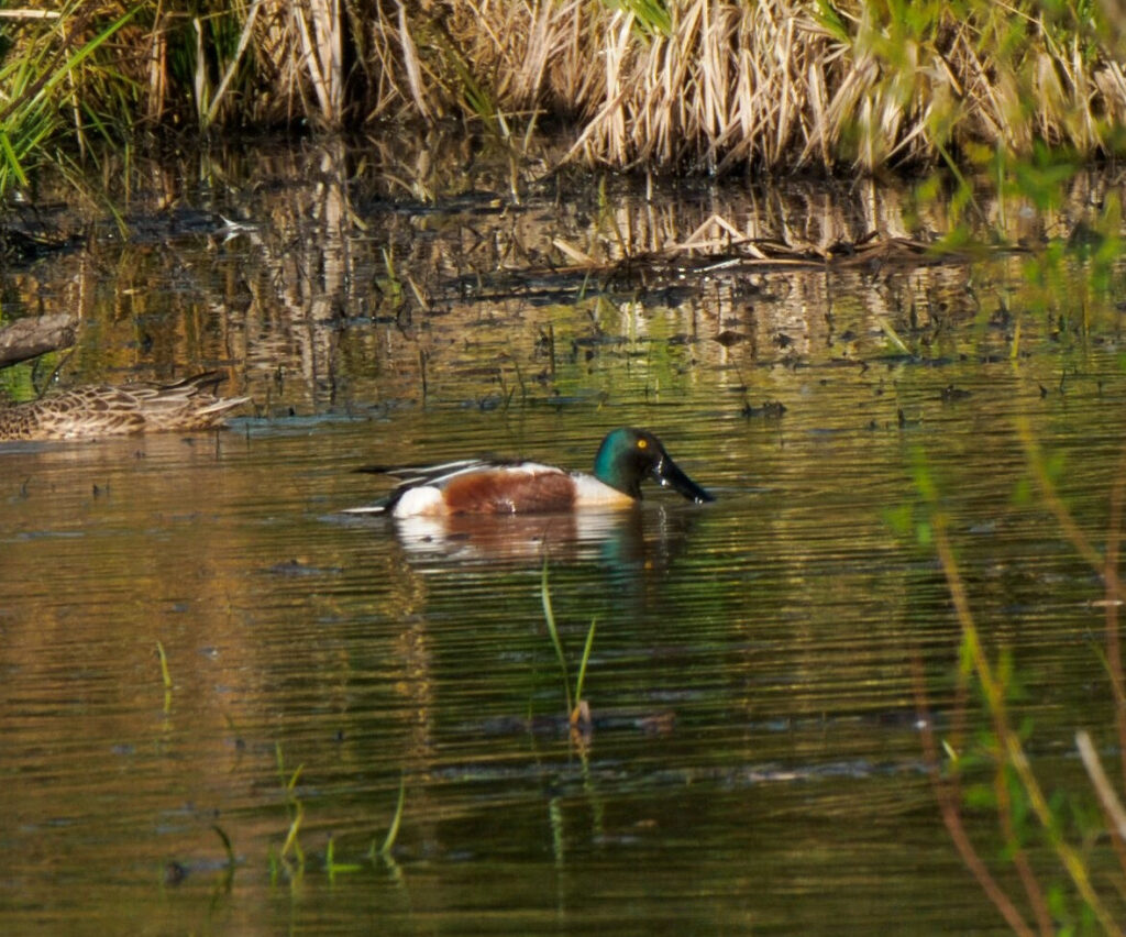 Moving along toward the far end of the marsh, the wetland opened up with a nice surprise. Four Northern Shovelers swept their distinctive bills through the shallows alongside two elegant Gadwalls, all of them seemingly unbothered by our admiration. The meadow and brushy edges buzzed with the emphatic witchety-witchety of Common Yellowthroats, and then one boldly hopped up to a prominent perch and showed himself off in full view. Crossing the road into the forest side of the preserve, a few Green Herons burst over the canopy, sweeping just above the treetops and drawing every eye skyward before quickly turning around and leaving in a hurry.