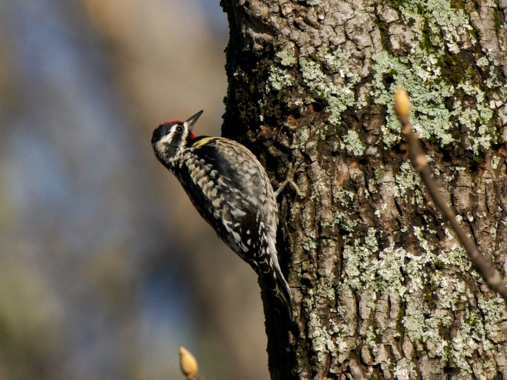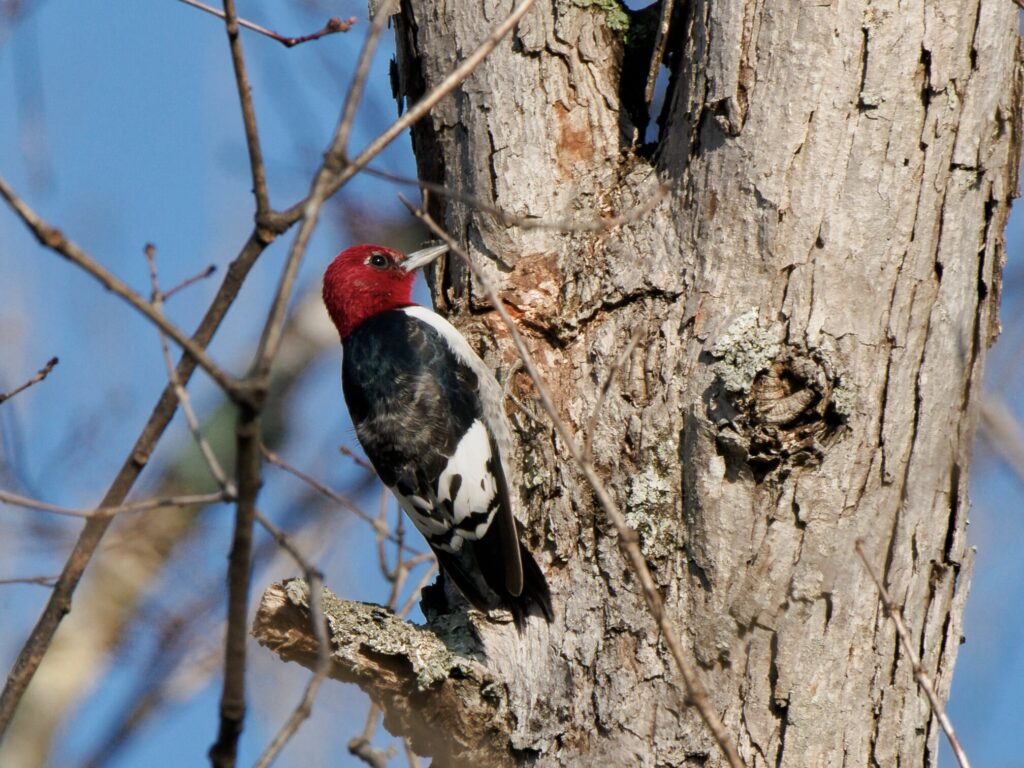 The woods were eager to reward our patience, where eventually we saw 49 species, including two swans flying in the distance but we couldn’t identify which kind. A bright Pine Warbler provided an early thrill, perching just over our heads and singing a steady trill for several minutes. Further along, a solitary, Red-breasted Nuthatch proved a little more elusive on a high branch, but we eventually caught satisfying looks of the stark black streak across its eye. A highlight of our 2.6-mile walk was a double sighting. A beautiful Red-headed Woodpecker shared the bare trees with a busy Yellow-bellied Sapsucker, and we watched quietly as the sapsucker methodically sipped sap from the holes it had drilled into the bark.